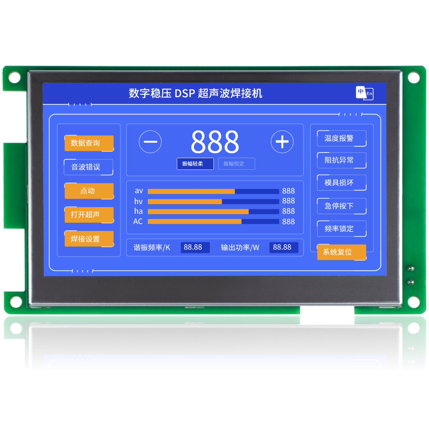 金璽HMI應用在超聲波控制上,安裝在控制機箱上對超聲波進行數據設定和監(jiān)控。